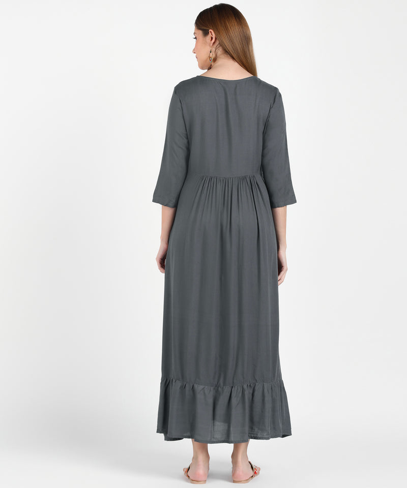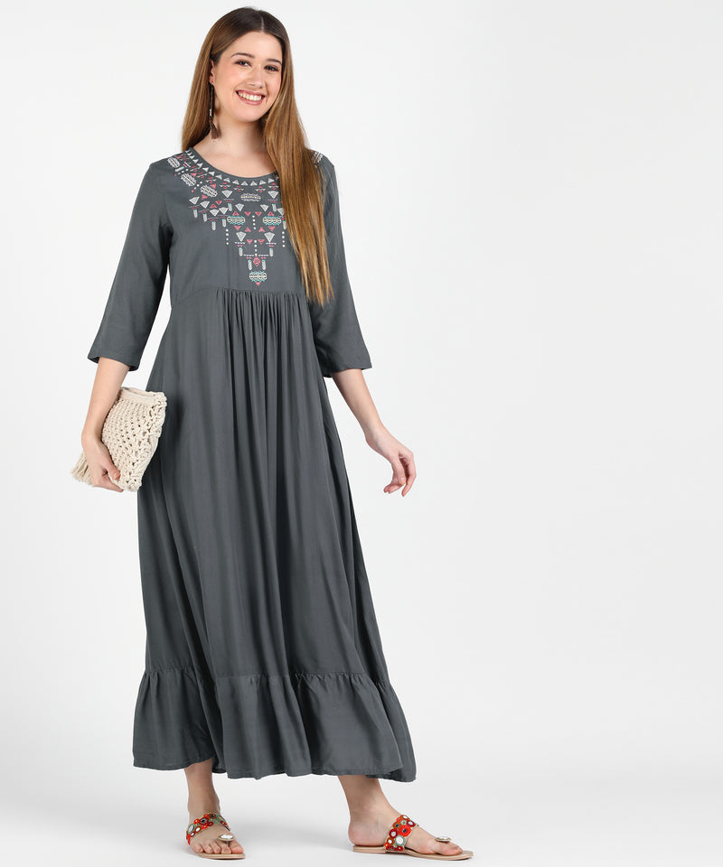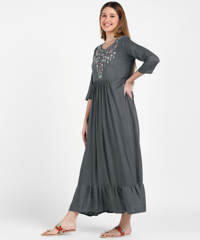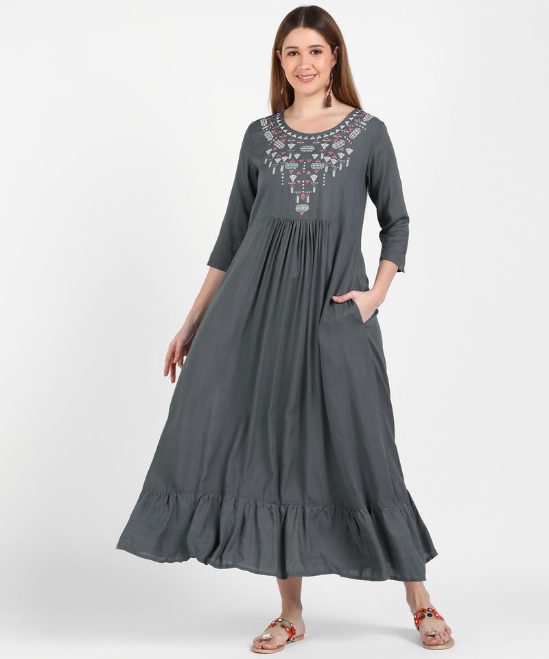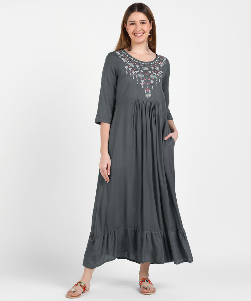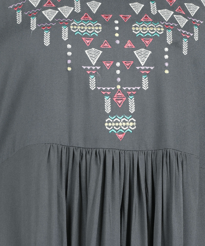 Made from soft, breathable fabric, it features intricate embroidery on the yoke and neckline, offering a sophisticated charm