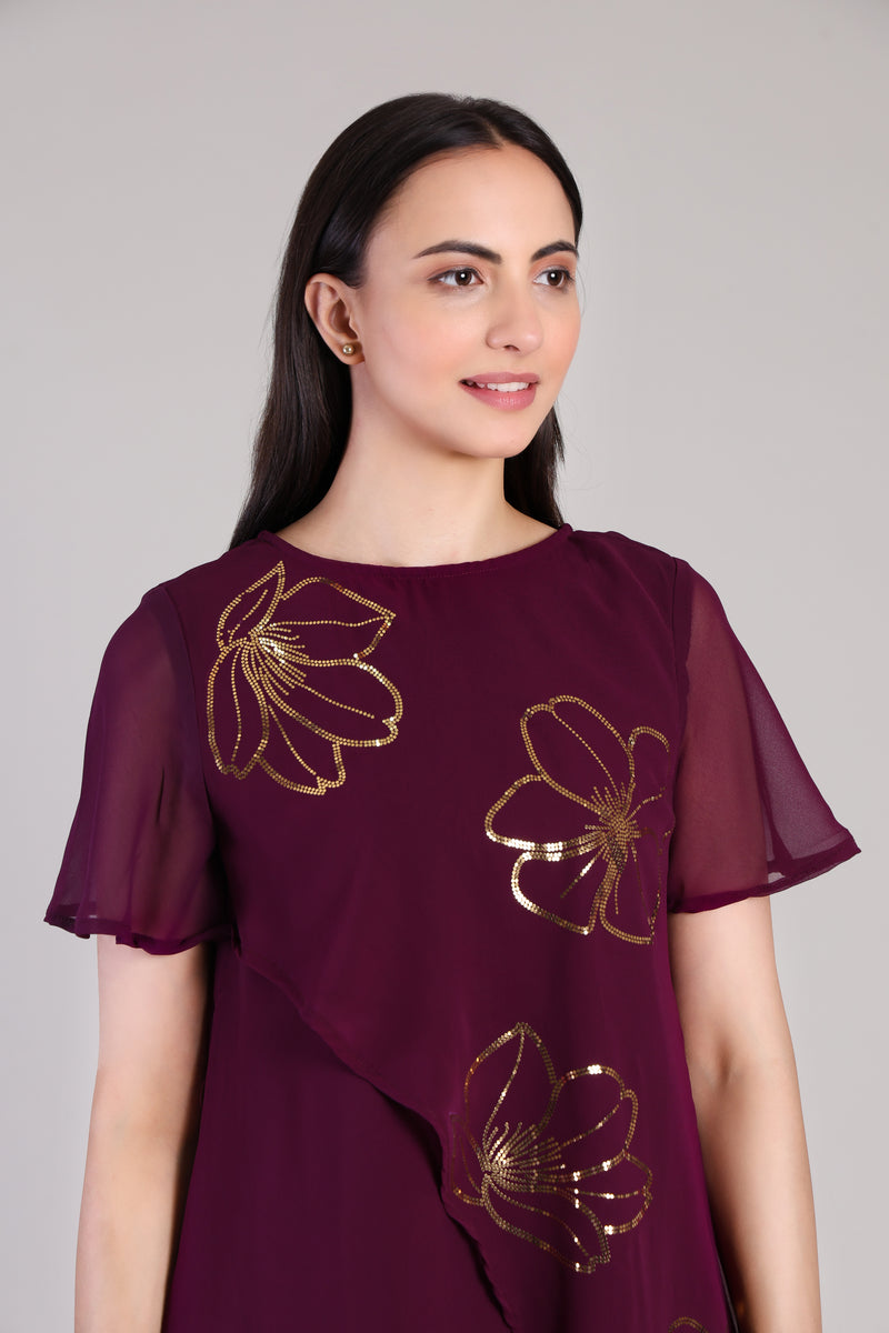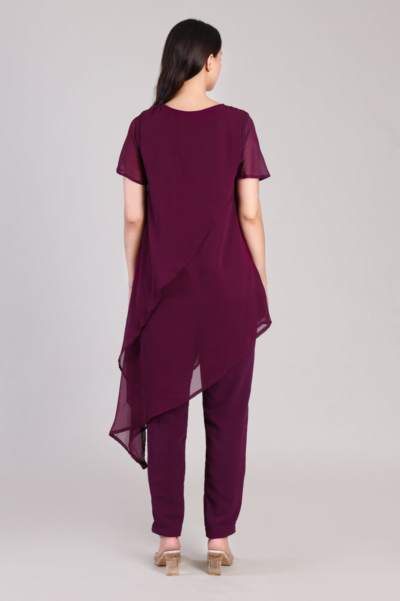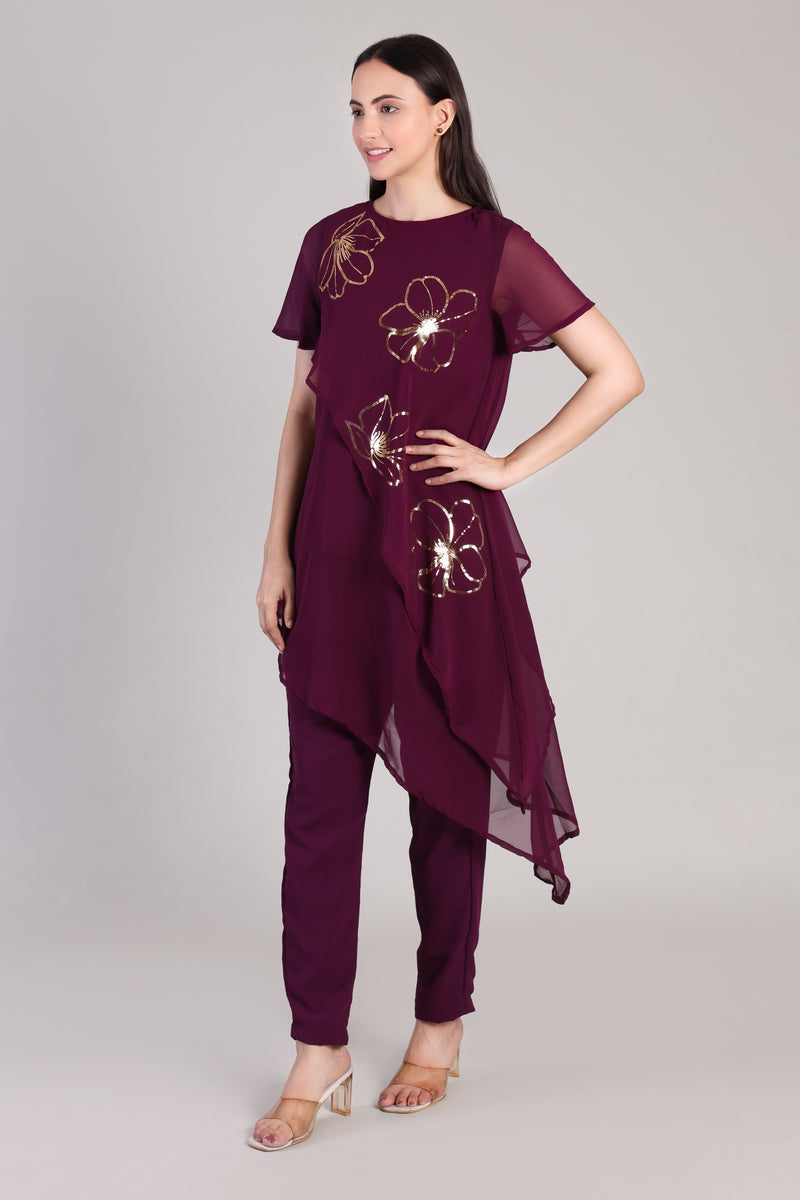Make a stylish statement with this Women's Sequins Motifs Embellished Georgette Asymmetric Kurti Pant Set.