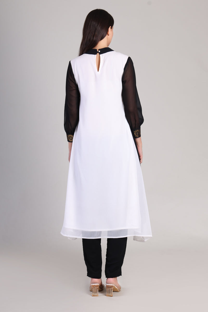 Step out in style with this Women's Sequins Motifs Embellished Georgette Colour Block Kurti Pant Set, a vibrant fusion of contemporary design and festive sparkle.