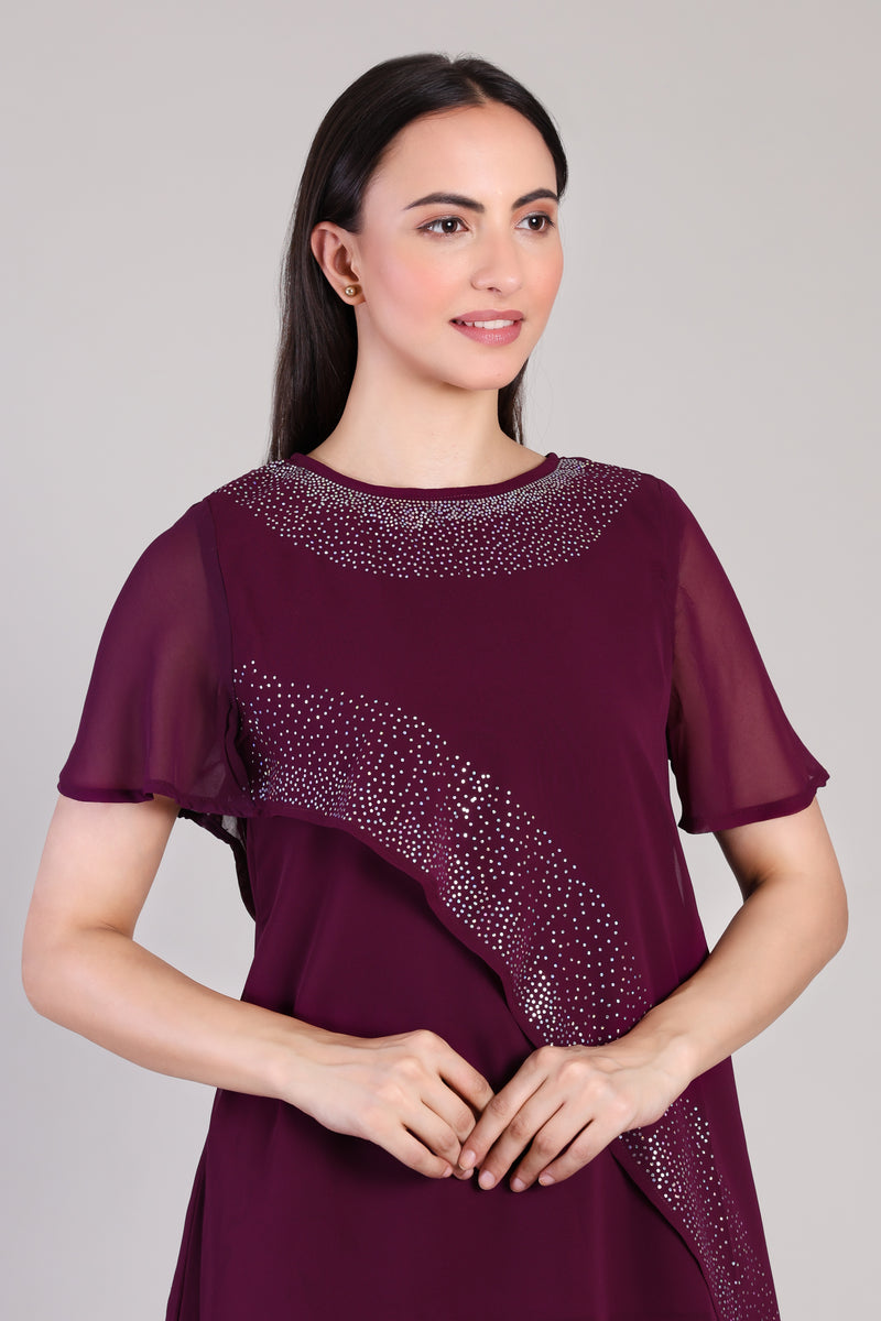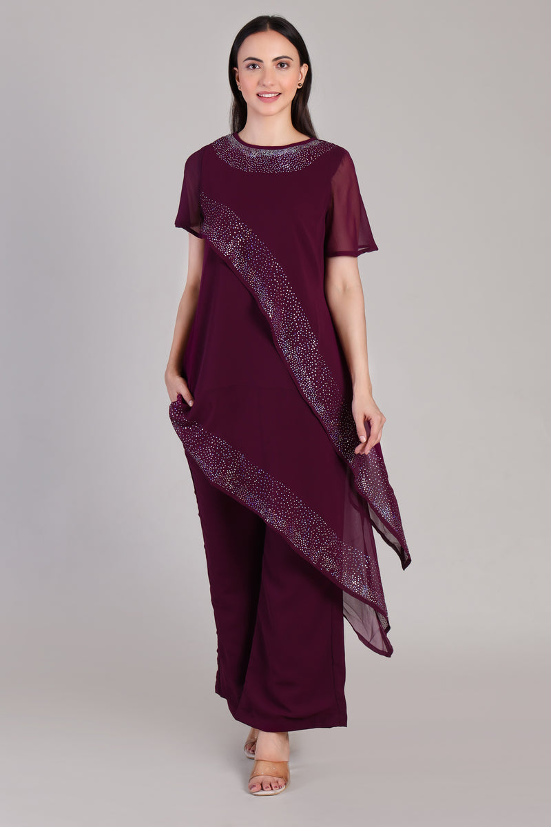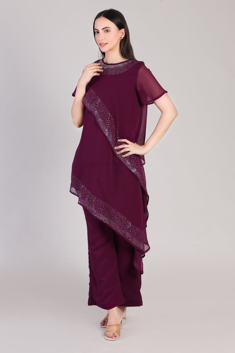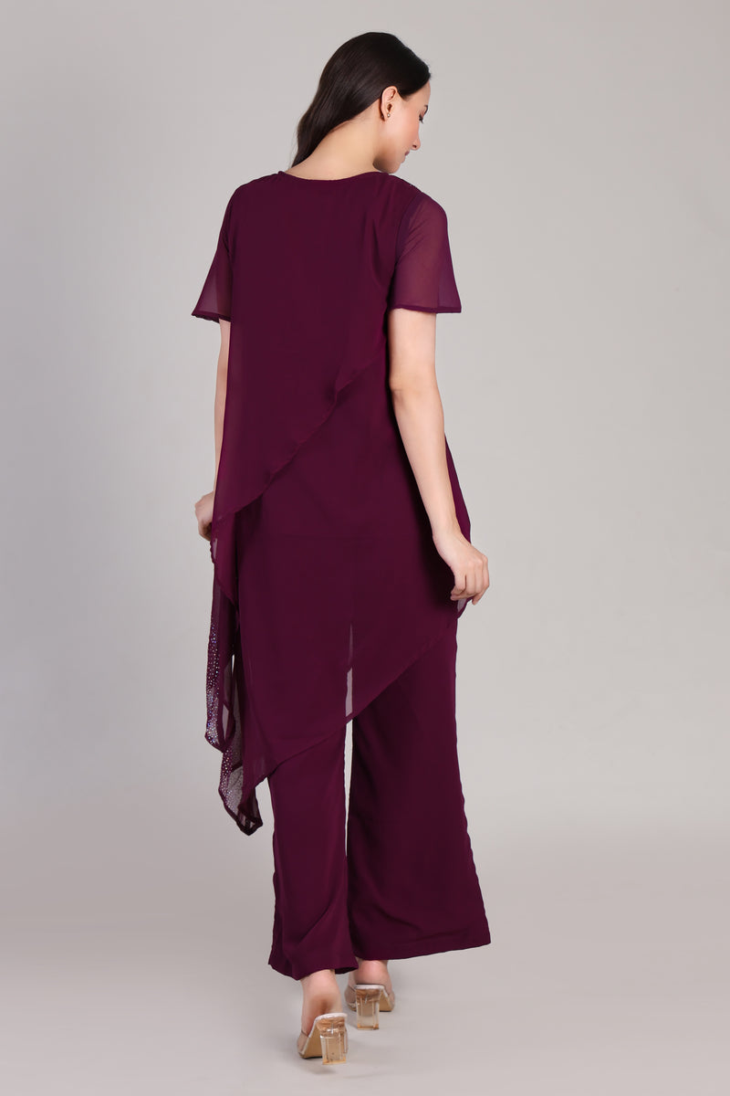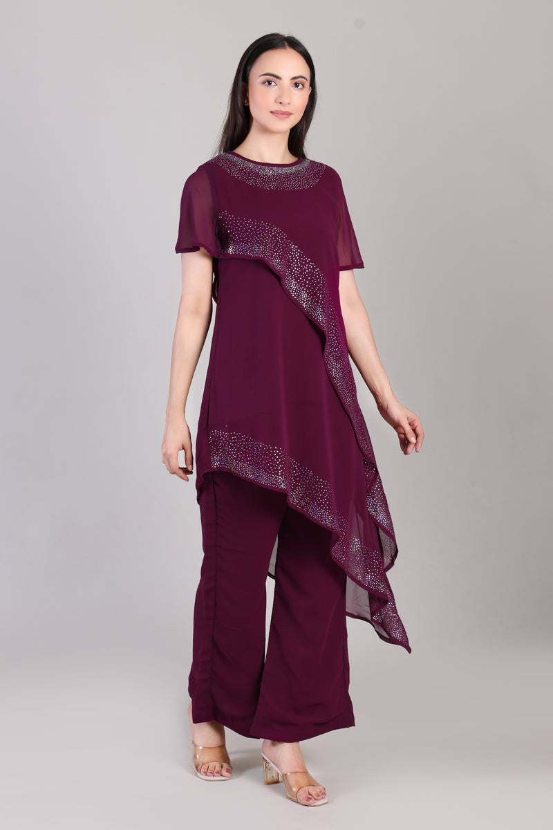 Add a dash of drama and elegance to your wardrobe with this Women's Sequins Motifs Embellished Georgette Frilled Set.