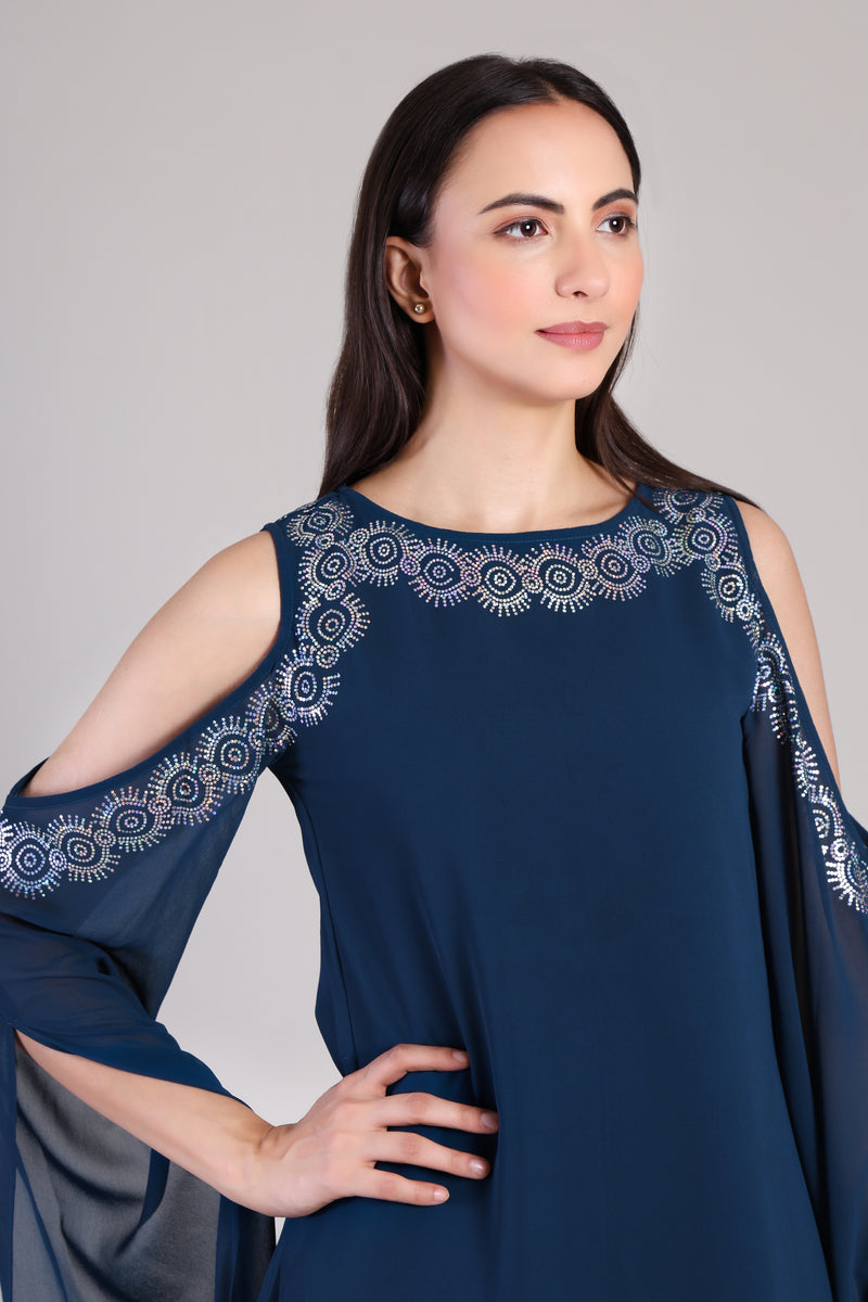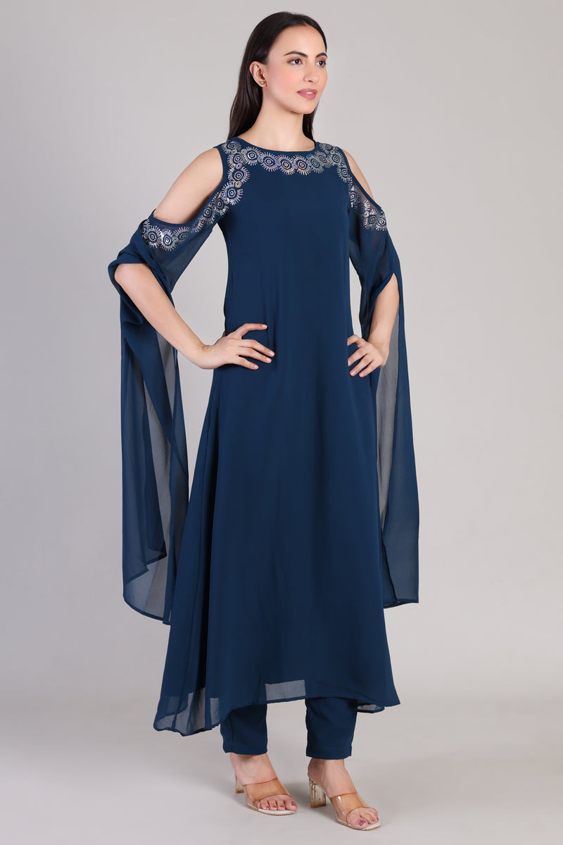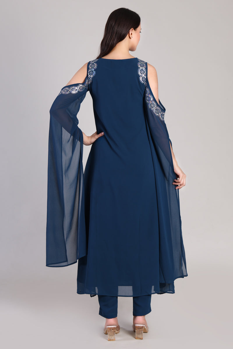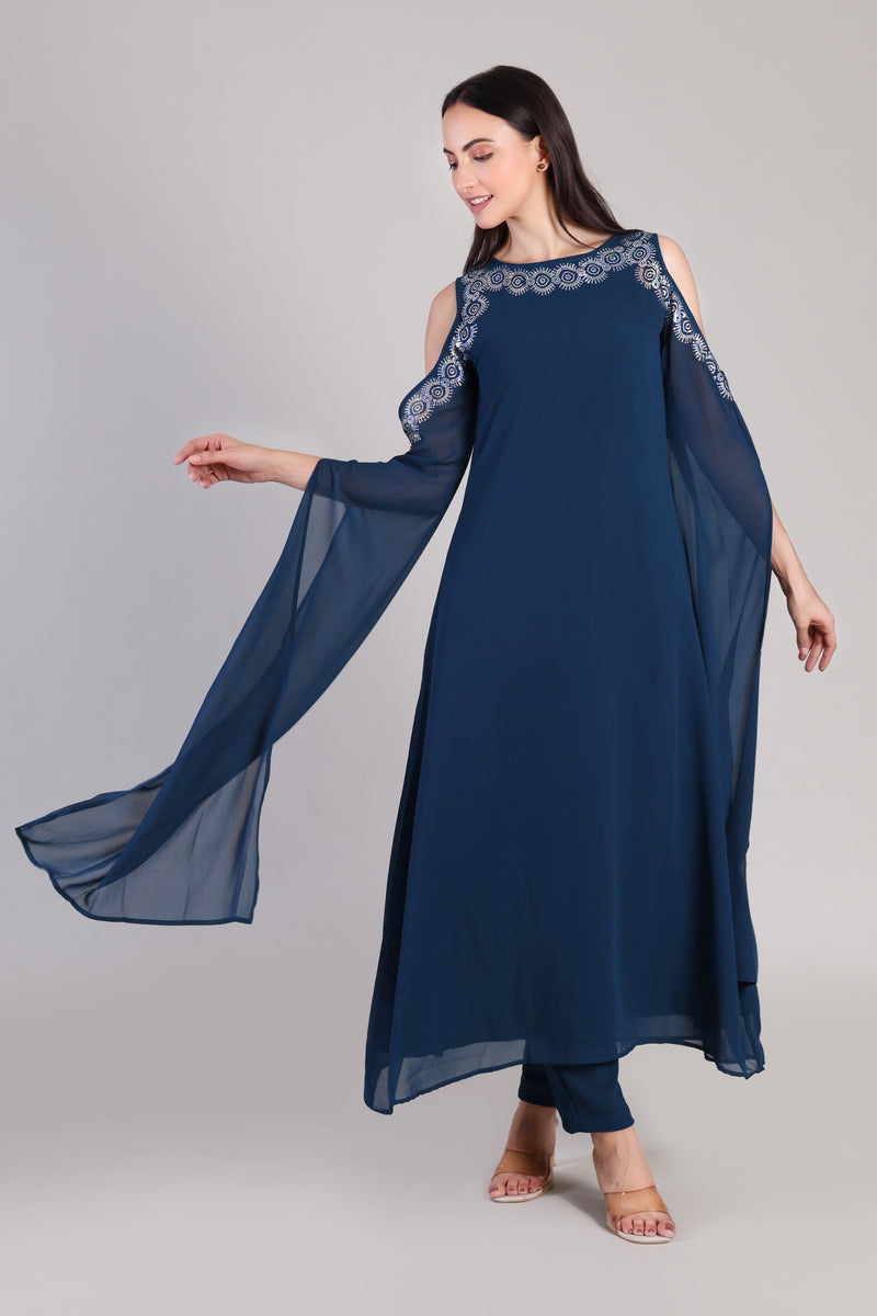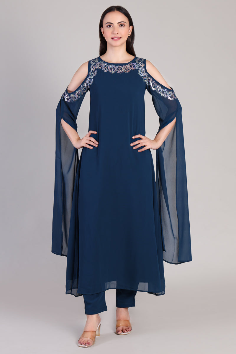 Embrace timeless elegance with this Women's Sequins Motifs Embellished Georgette Kurti Set, designed to bring out your festive flair with effortless grace.