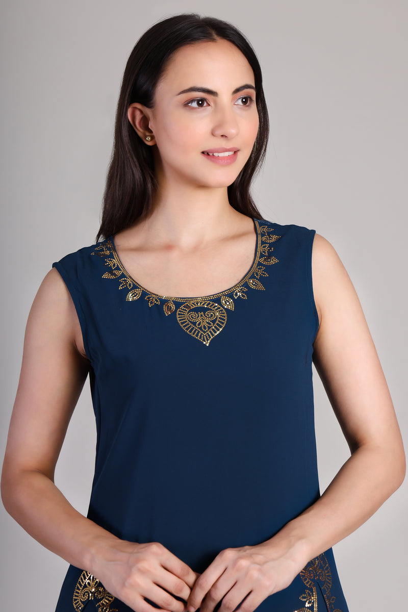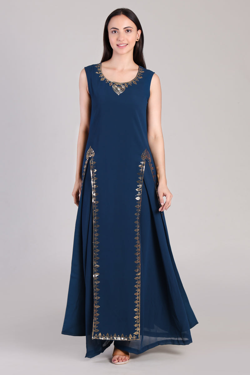 Add a touch of glamour to your ethnic collection with this Women's Sequins Motifs Embellished Georgette Slit Kurti Pant Set.