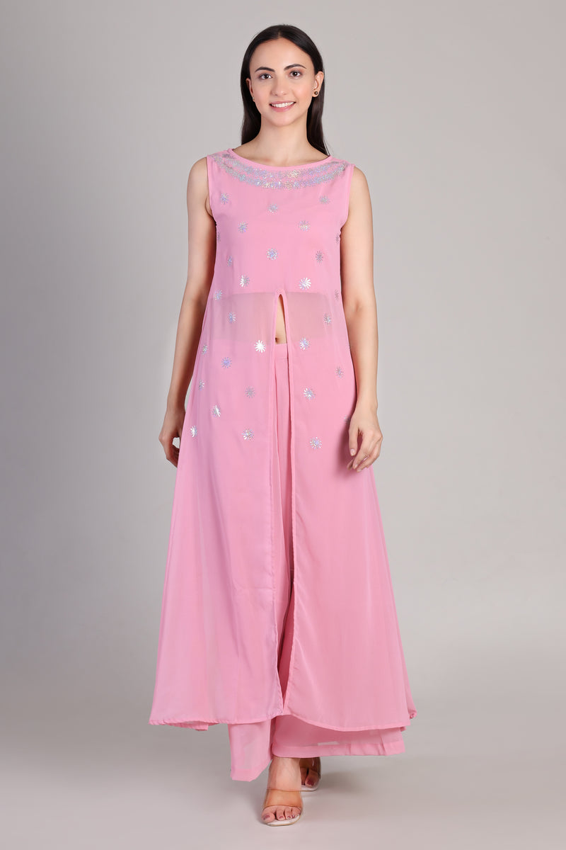 Add a touch of glamour to your ethnic collection with this Women's Sequins Motifs Embellished Georgette Slit Kurti Pant Set.