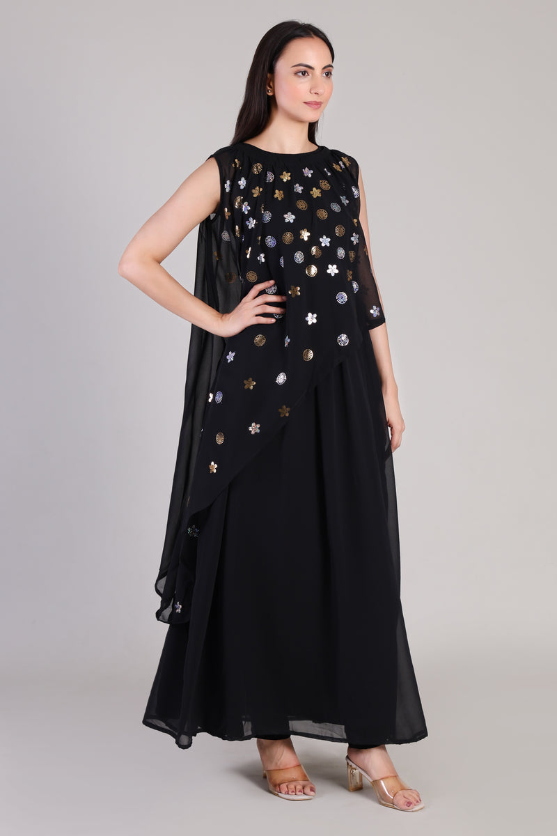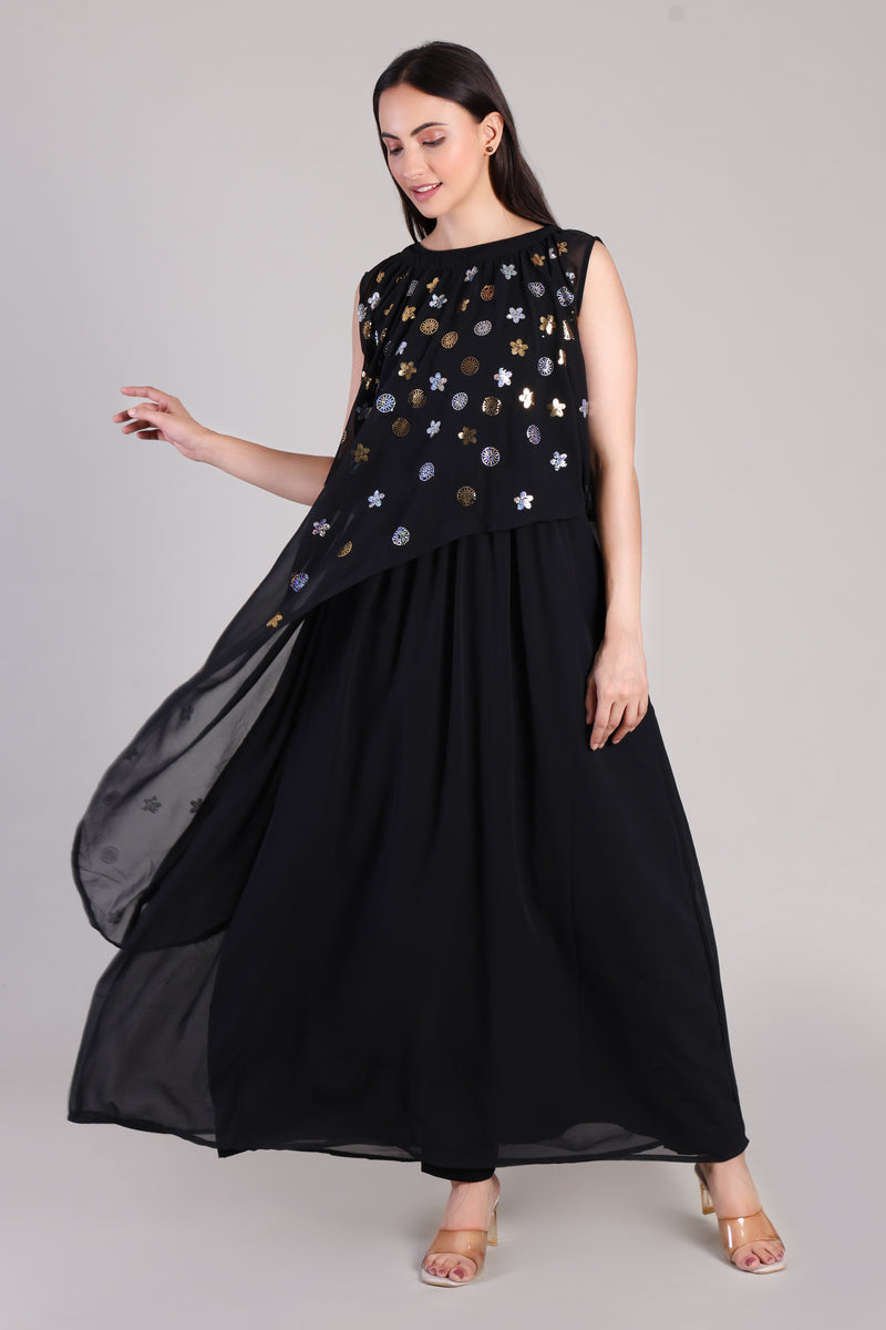 Turn heads with timeless charm in this Women's Sequins Motifs Embellished Georgette Two-Piece Set. A perfect blend of modern elegance and traditional sparkle, this set is designed to make you shine effortlessly at any celebration.