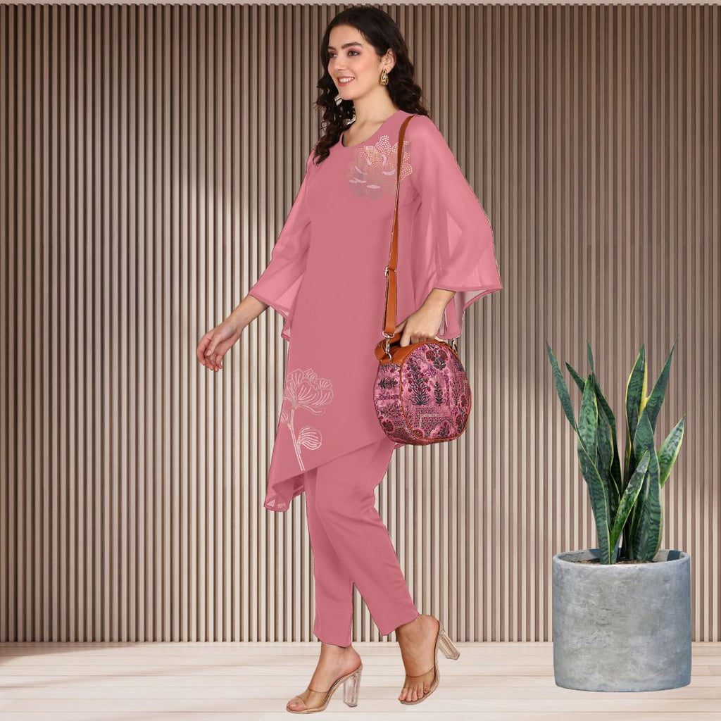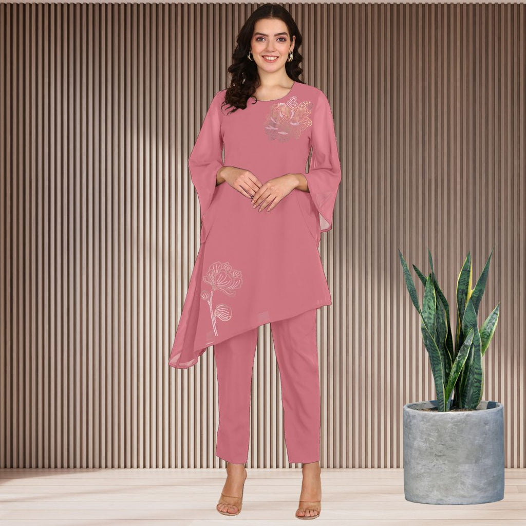 Introducing our Women's Sequins Motifs Embellished Asymmetric Kurti Pant Set, a perfect blend of traditional elegance and contemporary flair designed for the modern woman.