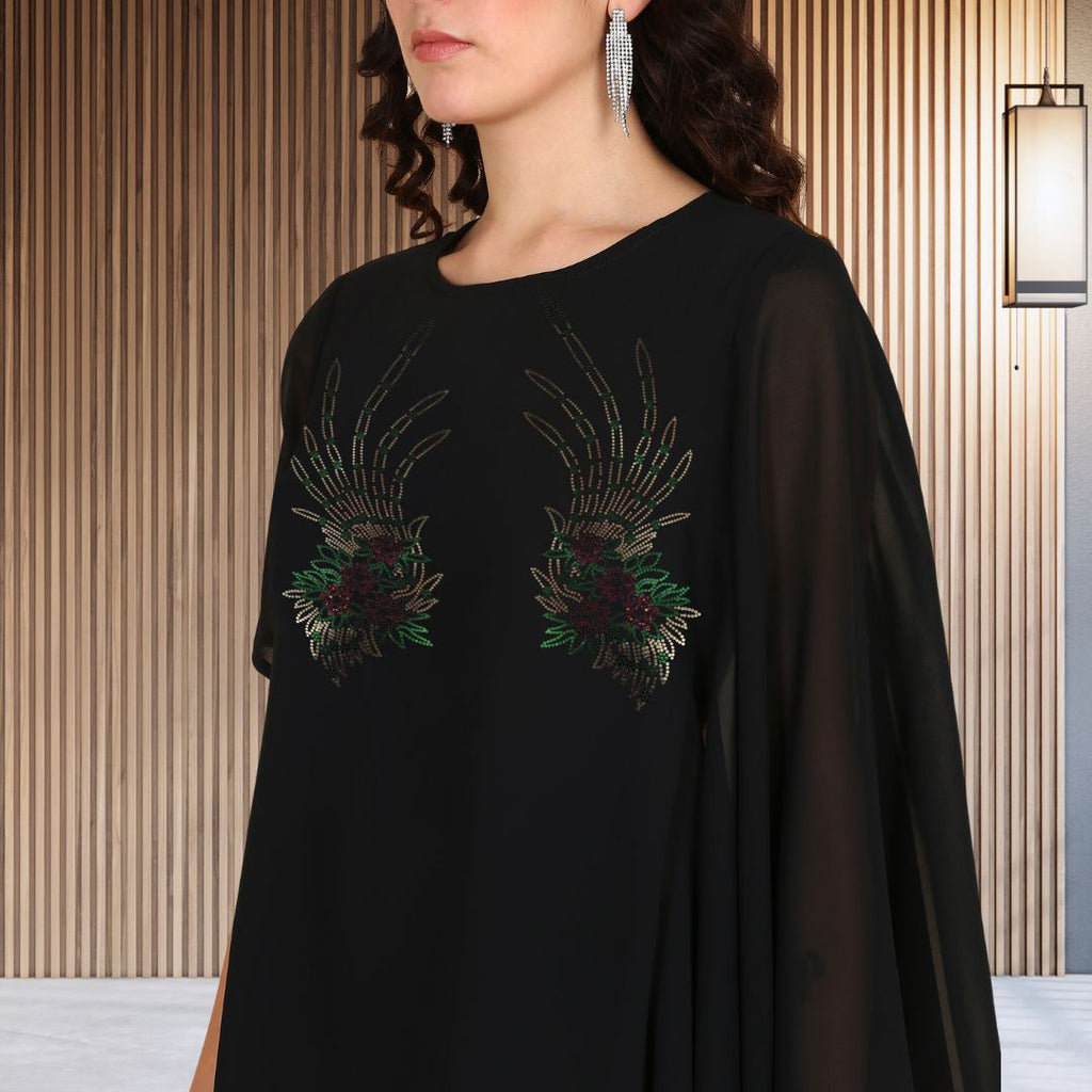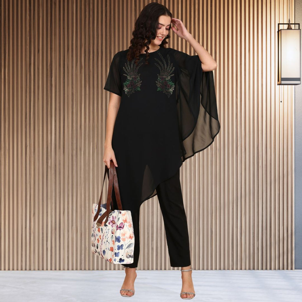 Elevate your ethnic wardrobe with this stunning Sequin Embellished Georgette Asymmetric Kurti Pant Set.