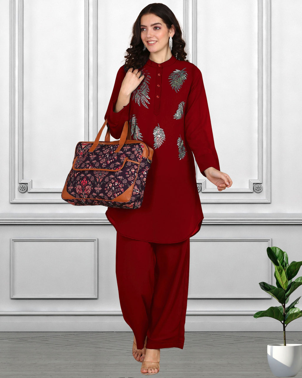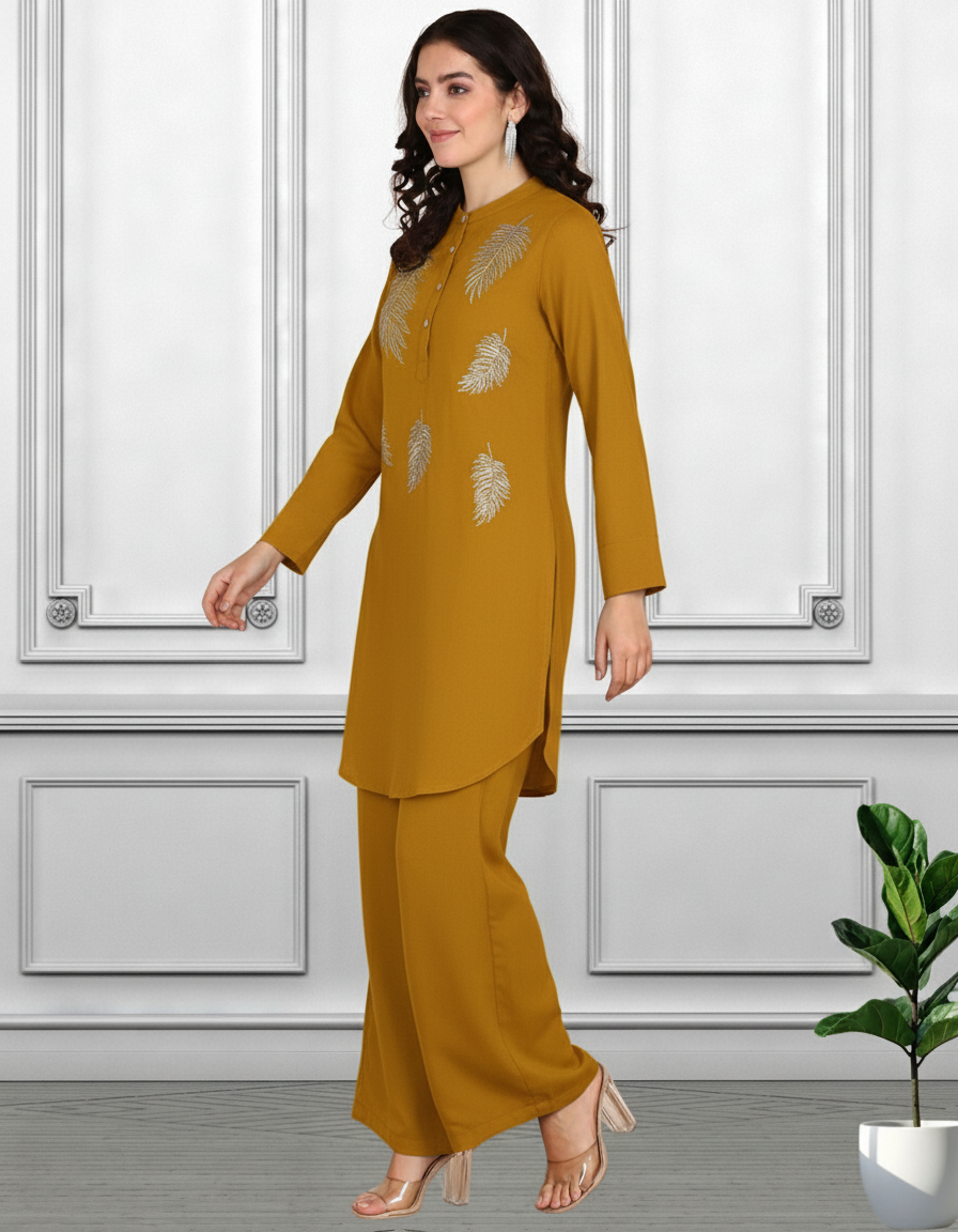 Add a touch of glam to your ethnic collection with this stunning Sequins Embellished Rayon Kurti Pant Set.