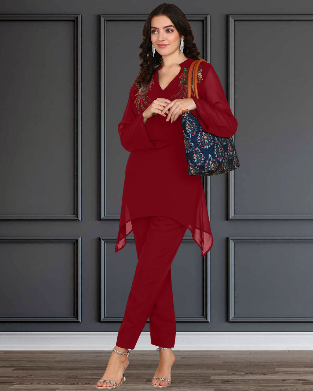 Elevate your festive and occasion wear wardrobe with this stunning Seaquins Motifs Asymmetric Georgette Set.